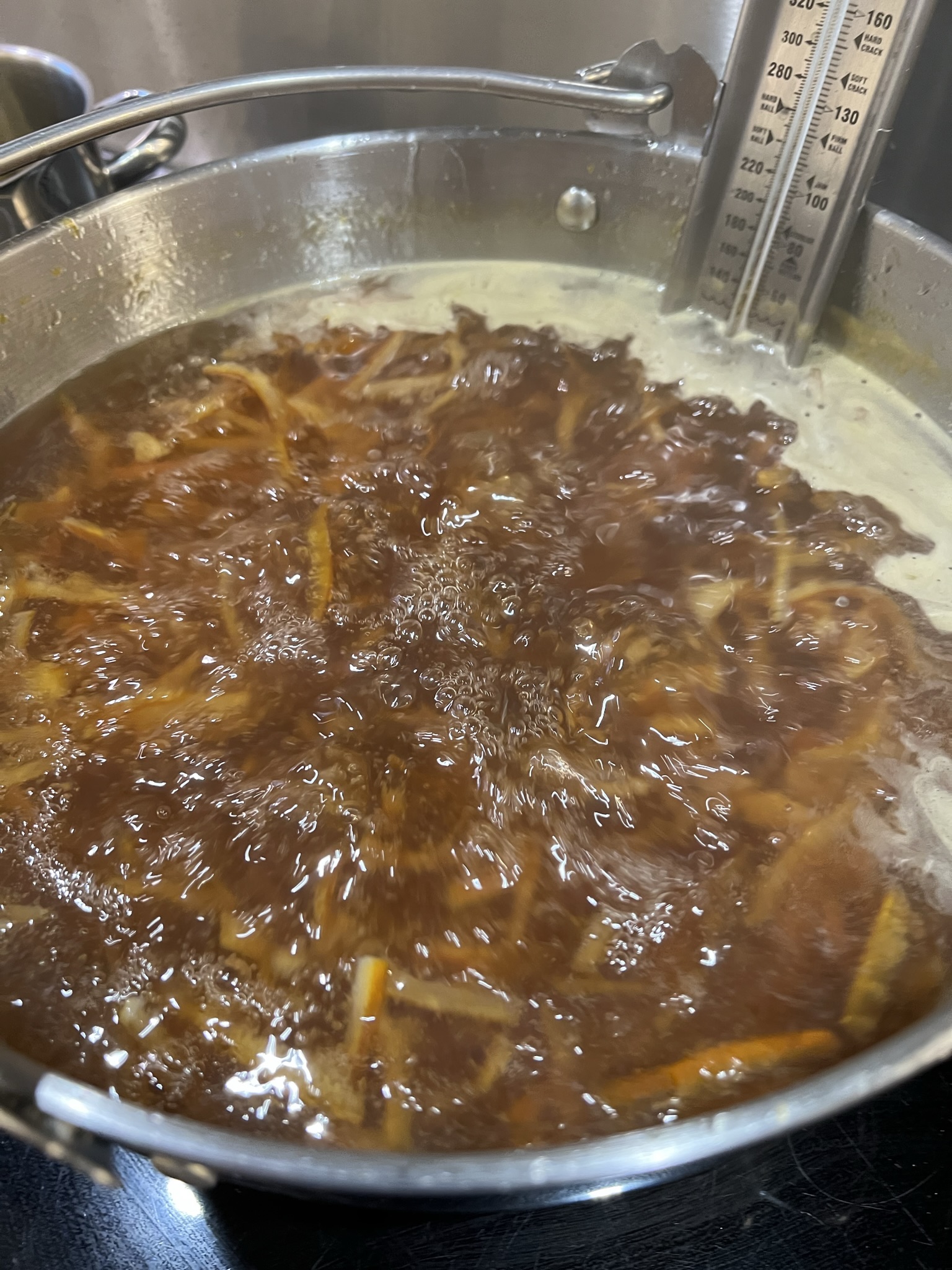 I’ve realised marmalade simply can’t be rushed. Don’t over-stir (it takes longer to heat), but stir enough to stop it sticking. And have something that distracts you from getting bored, but not so much that you forget your bubbling brew.